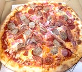 A rich and savory pizza topped with sausage, pepperoni, ham, mozzarella, and creamy ricotta on a golden crust.